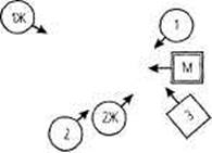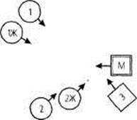 Рис. 22.1: М — муж (Раймунд); 1Ж — первая связь, мать 1; 1 — первый ребенок, дочь; 2Ж — вторая жена, мать 2 и 3; 2 — второй ребенок, дочь; 3 — третий ребенок, сын. Б.Х. (Раймунду): Напомни мне еще раз, что было в том твоем сне, о котором ты мне рассказал сегодня утром. Раймунд: Я увидел во сне своего сына, стоящего в дверях. Б.Х.: Это, конечно, значит, что ты сам там стоишь. То же самое видно из этой расстановки. Как чувствует себя первая жена? Первая жена: У меня боли в пояснице, там словно проходит сквозняк. Мне кажется, что я не могу двигаться. Все это очень странно. Б.Х.: Как чувствует себя первая дочь? Первый ребенок: Когда ты начал расстановку и мы были еще одни с матерью, я чувствовала себя хорошо. Сейчас же у меня начал болеть желудок. Это неприятно, но ничего страшного. Б.Х. (участнику, играющему роль Раймунда): Как чувствует себя муж? Муж: Мне довольно хорошо в моей теперешней семье, но присутствие там первой жены с ребенком мне неприятно. Двое других детей как будто охраняют это пространство вокруг меня. Б.Х.: Как чувствует себя вторая жена? Вторая жена: Не очень хорошо. У меня такое чувство, что мой муж словно не является моим настоящим партнером. Наши отношения похожи скорее на конфронтацию. Б.Х: Да, ты права. Вторая жена: И расположение моих детей мне не нравится. Например, то, что моя дочь стоит позади меня. Сына я могу по крайней мере видеть, и он меня тоже, и это уже лучше. Но для того, чтобы посмотреть на дочь, мне действительно пришлось бы приложить усилия. Б.Х. (первой жене, замечая, что ее боли в спине усилились): Повернись к остальной группе и тебе станет лучше. (Группе): При возникновении подобных реакций терапевту необходимо немедленно принять меры. (Б.Х. поворачивает женщину таким образом, что она оказывается не напротив, а рядом с дочерью.)