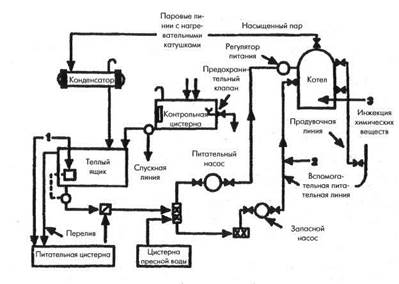 ТОЧКИ ИНЖЕКЦИИ ХИМИКАТОВ ДЛЯ НИЗКОГО ДАВЛЕНИЯ КОТЕЛЬНЫЙ КОАГУЛЯНТ КОНТРОЛЬ КОНДЕНСАТА Condensate Control — нейтрализующий летучий амин для использования во всех котловых системах, использующийся для повышения рН конденсата и пара до некоррозионного уровня (рН 8,3-9,0). Дозировка определяется по результатам ежедневного испытания рН конденсата. Condensate Control должен дозироваться с использованием непрерывной питательной системы. Он может вводиться при использовании измерителя расхода жидкости или дозирующего насоса в спускную трубу конденсатного насоса, теплый ящик, цистерну возврата конденсата или накопительный бак деаэратора. Condensate Control может дозироваться вместе с поглотителями кислорода. Однако оптимальное регулирование рН конденсата достигается при дозировании отдельно от системы дозировки гидразина. Дальнейшие рекомендации по дозировке продукта и предельным концентрациям смотрите в Справочнике морских химикатов. Boiler Coagulant — это полимерное соединение, используемое в котлах, загрязненных небольшими количествами масла, или в качестве кондиционера отстоя совместно с использованием контроля жидкости, когда испытываются высокие уровни твердых частиц. Boiler Coagulant должен дозироваться в количестве 250 см3 в день. Не нужны никакие испытания, если он применяется регулярно. Рекомендуется ежедневная быстрая продувка, чтобы удалить выпавшие в осадок твердые частицы или коагулянтное масло. Дальнейшие рекомендации по дозировке продукта и предельным концентрациям смотрите в Справочнике морских химикатов Следующая схема показывает типичную котловую систему низкого давления. Заметьте точки инжекции для химических веществ; при дозировке химикатов рекомендация для достижения наилучших возможных результатов — это всегда дозировать все химикаты в разбавленном виде на постоянной основе. 1. Дозировка в теплый ящик или питательную систему. Все химикаты должны до зироваться в этих точках. Однако, рекомендуемая дозировка контроля щелочности и контроля жесткости — это либо питательная линия № 2, либо инжектирование химических продуктов № 3 непосредственно в питательную цистерну на непрерывной основе. Все комбинированные продукты должны дозироваться в теплый ящик. 2. Дозировка в точку инжектирования № 2 требуется в питательную линию при помощи инжектора давления или дозировочного насоса. Дозирование должно быть непрерывным, однако вода должна подвергнуться ударной обработке.