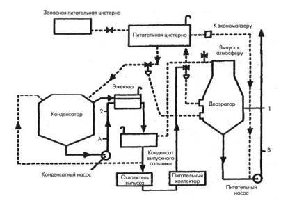 Типичная закрытая питательная система, установленная на котлах среднего и высокого давления парохода