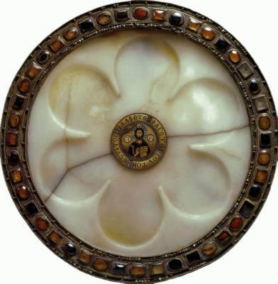 Рисунок 33. Евхаристическое блюдо или дискос. Алебастр, золото, серебро, перегородчатая эмаль, хрусталь, жемчуг. Диаметр 34 см. 11 в. Венеция, Сан-Марко. В центральном медальоне в технике перегородчатой эмали изображён Христос Пантократор. Евхаристическое назначение блюда выражено обрамляющей его круговой надписью: "Приимите, ядите, сие есть Тело Моё" (Мф 26, 26). [Средневизантийский или постиконоборческий период: Искусство столицы. Византийское искусство, S. 1473].