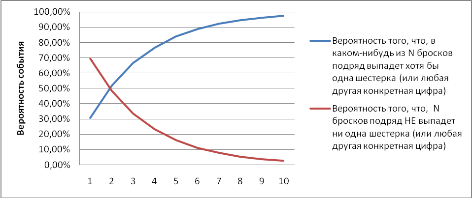 b) Какова вероятность того, что в двух бросках подряд выпадет хотя бы одна шестерка? Вероятность НЕ выпадения шестерки в 2 бросках подряд 48,23% (см. выше). Отсюда получаем, что вероятность выпадения хотя бы одной шестерки в хотя бы одном из двух подряд бросков равна 100%-48,23%= 51,77% c) Какова вероятность того, что N бросков подряд ни разу НЕ выпадет шестерка? Вероятность НЕ выпадения шестерки в каждом броске равна 25/36. Значит, в N бросках НЕ выпадение будет равно (25/36)^ N