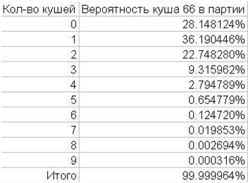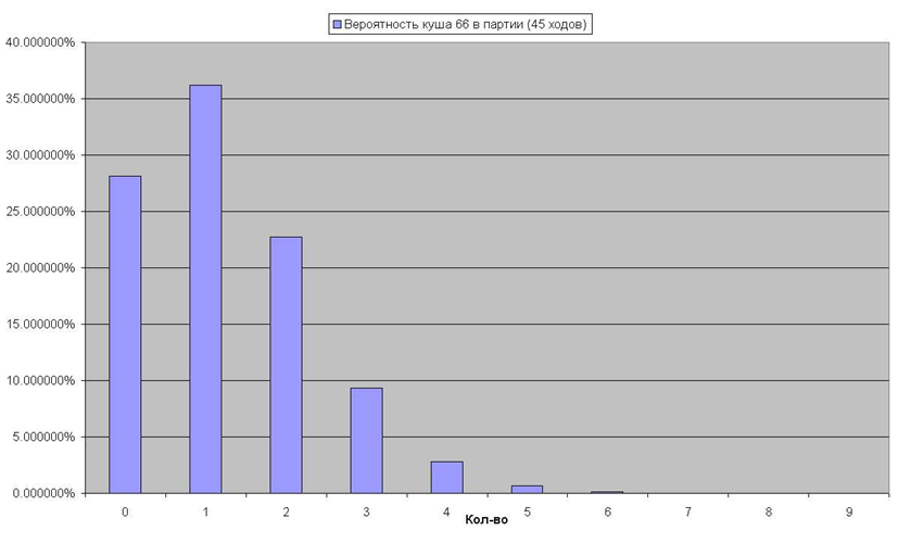 Б) Вероятность обычного броска (НЕ КУШ), не зависимо от того, что именно выпадет на зарах. Вероятность, что бросок будет куш, как мы выяснили выше – 6 из 36, значит вероятность обычного броска равна 36/36-6/36= 30/36=83,33% (100%-16,67%).