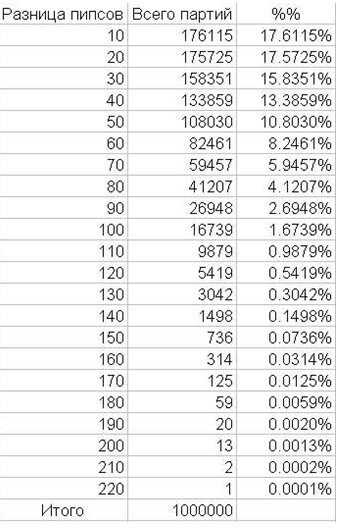 Пятая строка этой таблицы говорит о том, что каждая десятая партия должна заканчиваться с разницей в пипсах 50 очков. А первая строка должна вас приучить к тому, что примерно одинаково обоим игрокам (в пределах 10 пипсов разница) бывает только в каждой третьей партии. А в 2 из 3 партий разница будет больше. Еще одна забавная цифра: если вы сыграете 200 партий, то 3 из них закончастя с разницей в пипсах около 100 очков.