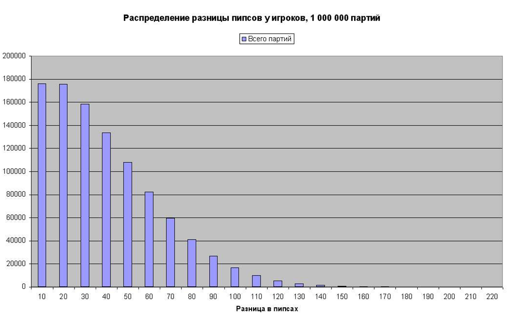 Как часто партия должна заканчиваться с разницей в пипсах всего 10 (в пределах 1 броска)? А с разницей 20 пипсов? Смотрите ниже таблицу и график.