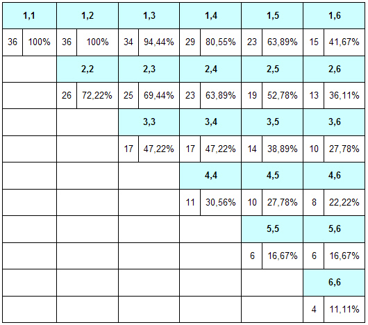 Вспомним классическую формулу вероятности события: Количество благоприятных событий Вероятность какого-либо условия = --------------------------------------------------------- Общее число всех возможных событий Начнем с одного броска зар. Это базовое, фундаментальное событие и знание вероятностей, связанных с одним броском необходимо для правильного восприятия игры длинные нарды. Всего бросков зар может быть 6*6=36 вариантов, по 6 вариантов второго зара на каждую цифру первого зара (1-*, 2-*, 3-*, 4-*, 5-*, 6-*).