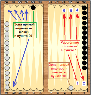 «Прямая видимость» - положение шашки относительно рассматриваемого пункта не далее 6 позиций. Готовясь занять свободный пункт следующим ходом, надо стараться поставитьсейчас шашку (шашки) на расстояние прямой видимости.