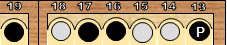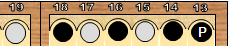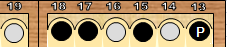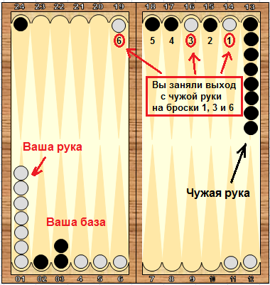 Вариант №14 (захвачены ходы с руки 4, 5 и 6, пункты 17, 18, и 19) дает шансы на победу на 10-20% выше, чем №1 (захвачены ходы с руки 1, 2 и 3, пункты 14, 15, и 16). Черные находятся в очень тяжелой позиции, и только удачные броски и очень точная игра в обороне могут спасти от поражения. Фактически здесь полное позиционное превосходство белых.