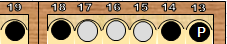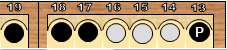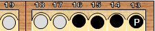 Чтобы не перегружать текст картинками, в дальнейшем будем показывать только верхнюю правую часть этой картинки. Например, последнюю картинку покажем так, как нарисовано ниже (буква Р внутри шашки означает «рука» черных):
