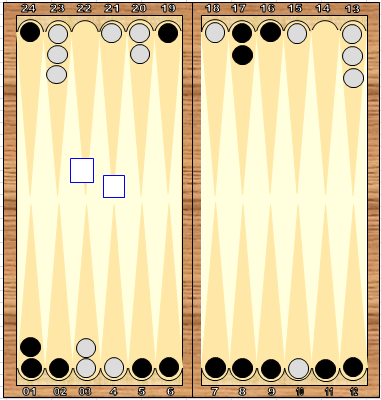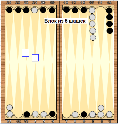В этой позиции белые могут перепрыгнуть блок, только бросив 6 (в любой комбинации). Вероятность такого броска 11 бросков из 36 (около 31%). Это, грубо говоря, один бросок из трех. Поэтому, во время остальных двух гипотетических бросков задача белых - накапливать шашки на пункт 15, чтобы ВСЕ броски с 6 использовать ТОЛЬКО для переброски шашек через блок. Такова единственно правильная тактика борьбы с чужим блоком. Более того, надо постараться собрать в пункт 15 не менее 5 шашек на случай, если будет бросок 6:6. Одна шашка в пункте должна оставаться всегда, чтобы блок не стал вовсе глухим, а 4 штуки перебрасываем при броске 6:6.