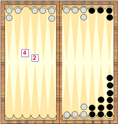 В этой таблице в колонке «если есть блок», напротив варианта броска пишете количество очков, если ход возможен и не пишите ничего, если ход невозможен. Например, если бросок 2:1, можно сходить только единицу, т.е. очков будет 1 (одно), но, учитывая, что и 1:2, хоть и для нас это одно и то же, но тоже дает одно очко. Итого на 1:2 и 2:1 – всего 2 очка. Или, например, 6:1. Здесь удастся сыграть и единицу и 6, всего 7 очков. Значит на 6:1 и 1:6 приходится 14 очков. Здесь ничего сложного нет, эти расчеты предельно просты, хотя и требуют большой рутинной работы. Поэтому более подробно разбирать их (расчеты) не будем. В дальнейшем, в основном, я буду давать результаты счета, чтобы не утомлять читателей. Теперь посмотрим те же цифры, если черные открыли не единицу, а двойку: Рис.5