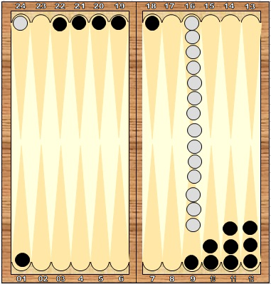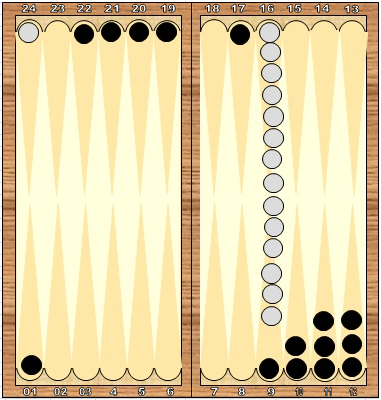 Всего около 4 ходов. Теперь заново пересчитаем исходную позицию по пипсам: Белые 1+14*9=127 пипсов или 127/8,17=15,54 ходов. Округляем до 16. Черные 20+19+18+17+16+15+4+6+6+3=124 или 124/8,17=15,18 ходов. Округляем тоже до 16. Однако белые должны потерять около 4 ходов. Т.е. 25% преимущество черных. Т.о. получаем, что шансы черных на выигрыш в исходной позиции равны 62,5%, белых 37,5. Завершая эту тему, хочу подчеркнуть еще раз. Данные выше подсчеты не являются математически строгими. Но их точность вполне достаточная для тех выводов, которые мы сделали выше. Кроме того, здесь важна сама схема подсчета потерь. Анализ, конечно, будет не полным, если мы не разберем еще два важных момента: Ø Как изменятся шансы игроков на выигрыш, если шашки стояли не все 14 в одном столбике? Ø Как изменятся шансы игроков на выигрыш, если шашек за блоком не одна, а две или больше?