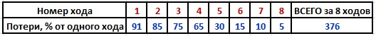 Вывод: Чтобы увеличить потери соперника, уходить надо в первую очередь дальней шашкой. Что будет происходить с потерями на блоке у белых дальше? Логично, что уйдя дальнюю шашку, черные будут держать блок, который блокирует 95% хода белых, пока эта шашка не дойдет до дома. Чтобы зайти в дом, черной шашке нужно пройти 14 пунктов. Средний ход составляет чуть больше 8, значит, черная шашка сделает 2 хода. Т.е. на второй ход черные новый пункт не откроют. Предположим, что в первый ход, после ухода первой черной шашки не выпала единица, тогда ситуация никак не изменилась и потери на втором ходе будут такие же (91%). Если же первый раз единица выпала (кроме 6:1), то расчет изменится. Вместо 26 очков уже будет 80 (используются любые шестерки), т.е. 73%. Если в первый раз выпало 1:1 потери будут чуть-чуть меньше. Усредняя все эти случаи «на глазок» можно сказать, что потери на блоке первый ход после вскрытия первого пункта (они откроют единицу) черными будут 91%, на второй ход около 85%. Уже на третьем ходу черные должны (если мы по-прежнему рассматриваем среднестатистическое развитие событий) открыть вторую шашку. Логично предположить, что опять дальнюю. Т.е. черные откроют на блоке уже ход и на 1 и 2. Дальше расчет усложняется и разветвляется. Если до этого белые не смогли сделать ни одного хода на единицу (единица не выпадала), то потери составят 74%. Если до этого уже одна шашка попала на первый открытый пункт, то потери сократятся до 58%. На четвертый ход могут варьироваться от тех же 74% до 30-40. Если не ставить себе целью провести математическое исследование и не гоняться за серьезной точностью, то можно констатировать следующее. После четвертого хода, когда черные откроют уже третий пункт, потери на блоке уже будут в любых случаях меньше 30%. Дальнейшее сохранение остатков блока имеет мало смысла, и дальше уже просто нужно уводить шашки в дом. Итого имеем примерно следующую картину по потерям: Рис.7