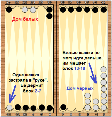Трех - четырех шашек за блоком бывает достаточно, чтобы рассчитывать на то, чтобы иметь равные с соперником шансы на выигрыш ойна. 5-6 шашек за блоком – уже ваши шансы на победу над соперником будут существенно выше, чем у него. Смысл ойнового блока – замедлить или даже остановить продвижение шашек соперника шестью своими шашками. Потом привести остальные девять шашек в зону выброса, построить там на младшие позиции, пока соперник топчется перед вашим блоком. И только потом уже увести оставшиеся шашки.