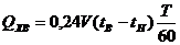 где V – количество проникающего в помещение холодного воздуха, кг/ч; 0,24 – теплоемкость наружного воздуха, КДж/(кг К); tB и tH – внутренняя и наружная температура воздуха; Т – время, на протяжении 1ч, в течение которого ворота находятся в открытом состоянии, мин. При отсутствии воздушных завес объем поступающего за 1ч через ворота воздуха определяется расчетом, но должен быть не более 75% объема помещения. Количество поступающего в помещение холодного воздуха зависит от направления и скорости ветра, температуры снаружи и внутри, ширины и высоты ворот. По суммарным теплопотерям определяют суммарную мощность котла: PК =(1,10...1,15)ΣQn 10-3, КВт. Потребность в топливе на отопительный сезон можно примерно определить по формуле: Q=gц v(tB-tН), кг (2.26) gц – годовой расход условного топлива, затрачиваемого на повышение температуры на 1°С в 1м3 помещения, кг/°С; V – наружный объем здания, м3.