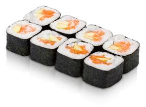Ингредиенты: · 100 г копченого лосося · 300 г готового риса · 100 г авокадо · 100 г огурцов · 3 листа нори · 100 г икры лососевых рыб · 3 ст. ложки соевого соуса · водоросли вакаме · маринованный имбирь · паста васаби · кунжутное семя · Расстелить на столе коврик. Расположить сверху лист нори (сторона расположения листа для этого вида роллов не имеет принципиального значения). Выложить рис на водоросль и аккуратно разровнять рис слоем толщиной 1 см по всей поверхности. Подождать некоторое время, чтобы водоросль впитала влагу и рис к ней прилип. Осторожно взять край водоросли и быстро перевернуть рисом вниз. Намазать лист васаби (по вкусу). Отступив от края на 1,5 см, расположить авокадо, нарезанный брусочками толщиной 1 см, нарезанные огурцы и тонкие ломтики копченого лосося и свернуть. сверху ролл посыпать икрой и кунжутом. подавать с соевым соусом и маринованным имбирем. Для украшения положить водоросли вакаме. · Время приготовления 50 минут. Ролл с тропическими фруктами
