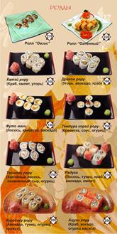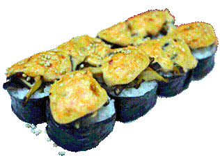 Ингредиенты: · 100 мл молока · 70 г риса · 50 г сливочного сыра · 1 мандарин · 1 киви · 30 г тертого шоколада · 2 ч. ложки сахара · разноцветная кокосовая стружка · пищевой краситель Способ приготовления: Рис замочить в воде на 1,5 - 2 часа. В кастрюлю налить молоко (в пропорции 1:1 с рисом), добавить сахар и размоченный рис. Довести рис до готовности. Мандарин разделить на дольки. Киви нарезать брусочками. Сливочный сыр окрасить пищевым красителем. Бамбуковый коврик (макису) обернуть сверху пищевой пленкой. Поверх пленки положить рисовую бумагу. Выложить рис и разровнять. Подождать некоторое время, чтобы рисовая бумага пропиталась и стала пластичной. Осторожно перевернуть лист так, чтобы рис оказался внизу, на пленке. Отступив 1,5 см от края, уложить брусочки сливочного сыра. киви, дольки мандарина и посыпать тертым шоколадом. Сформировать ролл с помощью коврика, посыпать кокосовой стружкой. Время приготовления 40 минут. Мозаика ролл Ингредиенты: · 2 лист нори размером 10*7 см · 100 г риса · 500 мл рисового уксуса · 40 мл мирина · 100 г сахара · 1/4 лимона · 10 г водорослей комбу · 20 г икры летучей рыбы · 20 г свежего огурца · 20 г плавленого сыра Способ приготовления: Рис промывать до тех пор, пока вода не станет прозрачной. Высыпать в кастрюлю и залить холодной водой так, чтобы вода покрывала рис на 2 см, довести до готовности. Рисовый уксус, соус мирин, сахар, сок лимона и водоросли комбу перемешать и поставить на слабый огонь. Томить 15 - 20 минут, не доводя до кипения. Горячий рис заправить полученным соусом и остудить. Рис смешать с икрой летучей рыбы, выложить на лист нори, сформировать рулет круглой формы и разрезать вдоль на 4 части. 2 части разрезанного ролла выложить на лист нори. Свежий огурец и плавленый сыр нарезать тонкими полосками и выложить на разрезанный ролл. Остальными частями разрезанного ролла накрыть сыр и огурец. Сформировать ролл квадратной формы и разрезать на 5 равных частей. Время приготовления 40 минут. Ролл с грибами