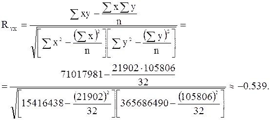 Вывод: из уравнения регрессии видно, что с ростом денежных затрат на одну голову продуктивность коров уменьшается. При этом коэффициент a1 показывает, что увеличение денежных затрат на 1 денежную единицу приводит к уменьшению продуктивности на 3,28 кг. Определим коэффициент корреляции, показывающий тесноту связи между урожайностью и себестоимостью продукции: