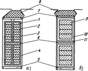 Рис. 4.3. Примеры заполнения пазов статора проводниками обмотки из прямоугольного провода и изоляцией: а — полуоткрытые пазы статора с проводниками подразделенных катушек; б — открытые пазы статора машины с номинальным напряжением 6 кВ; / — проводники обмотки; 2 — обволакивающее покрытие (для скрепления проводников); 3 — скрепляющая лента: 4 — корпусная изоляция (пазовый короб); 5 — прокладка на дно паза; б - прокладка между слоями обмотки; 7 — прокладка под клин; 8 — пазовый клин; 9— проводники обмотки с дополнительной витковой изоляцией; 10 — гильзовая корпусная изоляция; 11 — внешняя защитная лента как и во всыпных обмотках, не позволяет использовать обмотку этого типа в машинах с номинальным напряжением выше 660 В. Цельные катушки из прямоугольного провода, как правило, изолируют до укладки, поэтому их можно укладывать, только в открытые пазы (рис. 4.3,6). Корпусная изоляция катушек может быть непрерывной по всей длине, выполненной из ленточного изоляционного материала, либо гильзовой в пазовой и непрерывной в лобовых частях. И та и другая конструкция находит широкое распространение в современных электрических машинах. При напряжении более 6 кВ на внешнюю поверхность катушек обмотки наносят полупроводящее покрытие, служащее для предотвращения явления коронирования, возникающего на поверхности катушек в местах концентрации напряженности электрического поля, например в местах выхода прямолинейной части катушек из пазов. Стержневая обмотка применяется в статорах крупных электрических машин, например в турбогенераторах и гидрогенераторах, а также в фазных роторах асинхронных двигателей мощностью более 50— 60 кВт. Стержни статорных обмоток для снижения потерь от вихревых токов выполняют из большого числа параллельных элементарных проводников с площадью поперечного сечения 17 — 20 мм2, которые для уменьшения влияния эффекта вытеснения тока определенным образом переплетаются между собой — транспонируются (рис. 4.4). Конструкция корпусной изоляции стержней такая же, как и катушек из прямоугольного провода машин с высоким номинальным напряжением. Стержни обмоток фазных роторов асинхронных двигателей выполняют из медных прямоугольных проводов с большой площадью поперечного сечения. В пазовой части стержни обмотки крепятся пазовыми клиньями, в лобовых частях — проволочными бандажами или бандажами из стеклоленты. Короткозамкнутые обмотки применяют как основные в роторах асинхронных двигателей и как пусковые или демпферные в синхронных машинах. Короткозамкнутые обмотки роторов асинхронных двигателей выполняют либо заливкой пазов алюминием или его сплавами, либо из стержней. Литые обмотки применяют в подавляющем большинстве роторов асинхронных двигателей мощностью до нескольких сотен киловатт. Одновременно с заливкой стержней отливают замыкающие кольца обмотки с вентиляционными лопатками. Изготовление обмотки ротора методом заливки позволяет выполнять стержни ротора практически любой нужной конфигу-