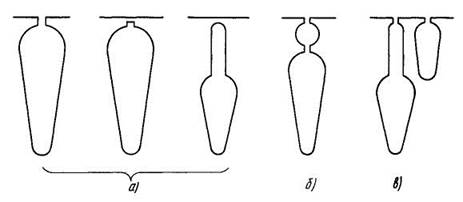 Рис. 4.4. Транспонированный стержень обмотки статора: а — стержень без корпусной изоляции; б — положение стержней в пазу статора Рис. 4.5. Пазы короткозамкнутых роторов с литыми обмотками: а — одноклеточных; 6 — двухклеточных; в — с неравномерной зубцовой зоной (с чередующимися пазами) рации, включая двойные клетки со сложными профилями поперечного сечения каждого из стержней или с чередующимися пазами (рис. 4.5). Для обмотки из вставных стержней в большинстве случаев используют медь, в двухклеточных роторах для рабочей обмотки — медь, а для пусковой — латуни, имеющие большее сопротивление и теплоемкость, чем медь, что особенно важно в двигателях, предназначенных для работы с тяжелыми условиями пуска. В некоторых сериях асинхронных двигателей, например АНЗ, короткозамкнутая обмотка роторов выполняется из алюминиевых стержней прямоугольного сечения, которые устанавливаются в открытые пазы ротора. Демпферные и пусковые обмотки синхронных машин выполняют из медных или латунных стержней, размещенных в пазах на полюсных наконечниках. В демпферных обмотках генераторов стержни каждого полюса замыкаются между собой по торцам с помощью сегментов. Стержни пусковых обмоток синхронных двигателей имеют общие замыкающие кольца для всех стержней обмотки. Обмоточным коэффициентом называют отношение геометрической суммы векторов ЭДС проводников, последовательно соединенных в фазу обмотки (ЭДС фазы), к алгебраической сумме ЭДС этих же проводников: ^об = 1Е-£шр1/Х!етр- Обмоточный коэффициент для любой обмотки может быть найден по векторной диаграмме - звезде пазовых ЭДС [5,10]. Для обмоток с фазной зоной п/т общим анали- тическим выражением для расчета большинства симметричных обмоток, кроме обмоток специальных машин (обмоток с q < 1, с не-равновитковыми катушками, с несплошной фазной зоной и ряда других), является где v — номер гармоники ЭДС (для основной гармоники v = 1); N определяется по числу пазов на полюс и фазу: если q — целое число, N = q, если q — дробное число, N = dq, здесь d — знаменатель дробного числа q (q = b + + c/d = N/d, где b — целая и c/d - дробная части числа q, N/d — несократимая дробь); Р — относительный шаг обмотки (укорочение или удлинение шага). В расчетной практике /соб удобнее представить в виде произведения коэффициента укорочения fcy на коэффициент распределения fcp: /Cq6 ~ ^у ^р- Коэффициент укорочения шага обмотки [п \ fey = sinlyPvl учитывает уменьшение ЭДС витка по отношению к алгебраической сумме ЭДС двух проводников, являющихся его сторонами. В зависимости от укорочения (удлинения) шага Р = >"расчА, где урасч — расчетный шаг обмотки. Расчетный шаг обмотки для различных типов обмоток принимают: для двухслойных обмоток (за исключе-