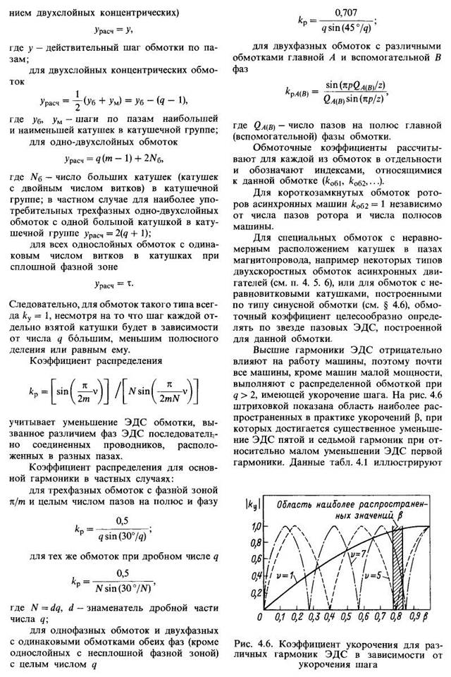 изменение кр различных гармоник ЭДС в зависимости от числа q обмоток трехфазных машин. обмоток машин переменного тока Обозначение выводов обмоток асинхронных и синхронных машин в зависимости от назначения обмотки, ее размещения в машине (на статоре или на роторе), числа концов, выведенных из машины для подсоединения к внешней цепи, и типа машины установлено ГОСТ 26772-85, который введен с 1.01.1987 г. взамен соответствующих пунктов (пп. 5.1-5.9) ГОСТ 183-74. ГОСТ 26772-85 предусматривает две системы обозначений: для ранее разработанных и модернизируемых машин и для вновь разрабатываемых электрических машин. Для ранее разработанных и модернизируемых машин сохраняется система обозначений, установленная ГОСТ 183-74, в соответствии с которой выводы обмоток синхронных и асинхронных машин обозначаются буквами русского алфавита (обмоток статора — буквой С, ротора — буквой Р, обмоток возбуждения синхронных машин — буквой И) и цифрами. Обозначение выводов трехфазных асинхронных и синхронных машин приведено в табл. 4.2. Выводы обмоток статора однофазных синхронных машин обозначаются: С/ — начало фазы, С2 — конец фазы; обмотки возбуждения: И1 — начало, И2 — конец. Выводы обмоток однофазных асинхронных двигателей обозначаются: начало главной обмотки — С1, конец — С2; начало вспомогательной обмотки — В1, конец — В2. Концы обмоток, соединенные между собой внутри машины и не выведенные на клеммную доску коробки выводов или к контактным кольцам, не обозначаются. Например, в обмотке статора трехфазной машины, соединенной в звезду внутри машины, обозначаются только начала фаз С1, С2 и СЗ, а при наличии четырех выводов — вывод нулевой точки (точки звезды) О. В фазных роторах асинхронных двигателей обозначения наносят только на выводы обмотки, соединенные с контактными кольцами. Вывод первой фазы Р1 должен быть присоединен к наиболее удаленному от обмотки ротора контактному кольцу; вывод Р2 — к среднему, вывод РЗ — к ближайшему к обмотке кольцу. Обозначение самих колец не обязательно. На чертежах схем обмоток обычно обозначают все начала и все концы фаз, причем концы фаз обмотки ротора обозначают аналогично концам фаз обмотки статора, т. е. Р4, Р5, Р6. Начала и концы фаз секционированных обмоток машины обозначаются теми же буквами и цифрами, что и простые обмотки, но с добавлением перед прописными буквами цифр, определяющих каждую из обмоток. Так, при двух обмотках в машине выводы первой из них обозначаются 1 Cl, 1C2, 1СЗ — начала фаз и 1С4, 1С5, 1С6 — концы фаз; выводы второй обмотки — соответ-