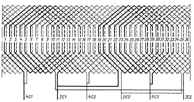 Рис. 4 17. Схема двухслойной двухскоростной обмотки статора, z = 36, 2р = 4/2, соединение Д/УУ двухскоростные двигатели, рис. 4.17). Последний метод широко применяется, в частности, для изменения числа полюсов двигателей в отношении 1:2 (двигатели 4A100S8/4Y3, 4А180М12/6УЗ, 4А200Ь4/2УЗ и др.). В последние годы разработаны схемы обмоток, дающие возможность путем переключения катушечных групп изменять числа полюсов и в отношении, отличном от 1:2, с сохранением достаточно высокого обмоточного коэффициента для обеих частот вра- Рис. 4.18. Принципиальная схема соединений двухскоростного асинхронного двигателя по методу ПАМ: 1 — 9 — катушечные группы обмотки; НС1 — НСЗ — выводы обмотки для включения на низшую частоту вращения; ВС1 - ВСЗ - выводы обмотки для включения на высшую частоту вращения щения и числа выводных концов обмотки (не более шести). Особенность этих схем заключается в специфической компоновке катушечных групп из разновитковых катушек, при которой изменение точек подсоединения обмотки к питающей сети приводит не только к изменению полярности отдельных катушечных групп, но и к переключению групп между фазами или даже к отключению отдельных катушек. При переключениях изменяется и амплитуда МДС обмотки при разных числах полюсов, поэтому такой метод построения схем называют полюсно-ам-плитудной модуляцией (ПАМ). Принцип переключений, характерный для этого метода, иллюстрируется принципиальной схемой (рис. 4.18). Такие полюснопереключаемые обмотки находят применение, например, в двухскоростных асинхронных двигателях серии 4А h = 180 4-250 мм при соотношении чисел полюсов 8:6. Полюснопереключаемые обмотки асинхронных двигателей серии 4А с h = = 160 -г- 200 мм при соотношении чисел полюсов 6: 4 построены по схеме Харитонова. Двигатели имеют две обмотки: основную двухслойную и дополнительную однослойную (рис. 4.19). Основная обмотка — полюс-нопереключаемая. При соединении на 2р = 4 включается только основная обмотка, соединенная треугольником при а = 1. При работе двигателя на 2р = 6 основная обмотка соединяется в звезду с двумя параллельными вет- вями и последовательно с ней включается дополнительная обмотка (рис. 4.19, в). Для трехскоростных и четырехскорост-ных асинхронных двигателей используют оба принципа изменения числа полюсов: устанавливают две независимые обмотки, каждая из которых (в четырехскоростных) или одна из них (в трехскоростных двигателях) выполняется полюснопереключаемой. В обмотках в большинстве случаев используют более простые схемы переключения числа полюсов в отношении 1:2. Так, двигатели 4А112М6/4/2УЗ имеют две независимые обмотки статора, одна из которых рассчитана на шесть полюсов, а вторая полюсно-переключаемая — на два и четыре полюса. В двигателях 4А180М12/8/6/4УЗ обе обмотки выполнены полюснопереключаемыми, одна—на 12 и 6 полюсов, а вторая — на 8 и 4 полюса. В четырехскоростных двигателях серии 4А с высотами оси вращения 100 мм при соотношении чисел полюсов 8:6:4:2 обмотка на соотношение числа полюсов 8:6 построена по методу ПАМ. Схемы каждой из обмоток таких машин не имеют принципиальных отличий от рассмотренных выше. двухфазных и однофазных двигателей Двухфазные и однофазные двигатели имеют на статоре две обмотки (две фазы обмотки), расположенные с пространственным сдвигом их осей на электрический угол 90°. Двухфазные двигатели применяются для управля