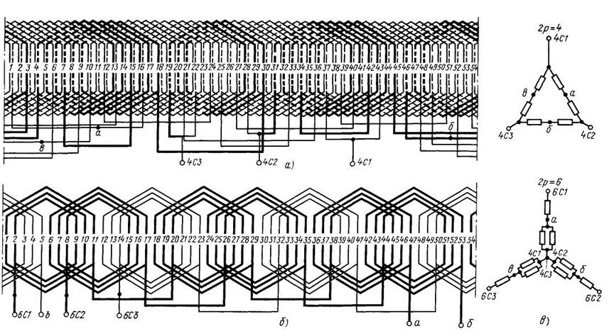 Рис. 4.19. Полюснопереключаемая обмотка по схеме Харитонова, z = 54, 2р = 6/4: а — основная обмотка; б — дополнительная обмотка; в — соединение основной и дополнительной обмоток на 1р = 4 и 6