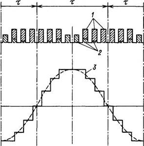 Рис. 4.24. Распределение проводников синусной обмотки по пазам статора и кривая МДС обмотки асинхронного однофазного двигателя с пусковой фазой: 1 — проводники рабочей обмотки; 2 —проводники пусковой обмотки; 3 — кривая МДС В ряде специальных машин малой мощности применяют более сложные обмотки с неравновитковыми катушками, например синусную обмотку. В синусной обмотке проводники фазы распределены в пазах неравномерно. Их число меняется от паза к пазу, что позволяет приблизить кривую МДС фазы к синусоидальной кривой (рис. 4.24). Обмоточный коэффициент таких обмоток рассчитывается с помощью векторных диаграмм — звезд пазовых ЭДС.