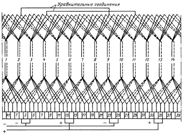 В простых петлевых обмотках у = ук = = ± 1 и У = У1—У2- Большее распространение получили обмотки с у, = + 1 (рис. 4.27), так как при ук = — 1 лобовые части секций несколько удлиняются и возникает дополнительное перекрещивание в лобовых частях обмотки. Первый частичный шаг петлевой обмотки близок к полюсному делению: у1 = = z3/2p ± %,, где \ — дробь, при которой у1 — целое число. Величина £, характеризует укорочение (удлинение) шага yt по сравнению с полюсным делением. Обмотки с укороченными шагами более употребительны. Петлевая обмотка требует установки щеток через каждое полюсное деление, т. е. на 2р щеточных болтах. При этом в обмотке образуется 2р параллельных ветвей. Таким образом, в простой петлевой обмотке число параллельных ветвей всегда равно числу полюсов, т. е. 2а = 2р. Несимметрия ЭДС и сопротивлений параллельных ветвей вызывает возможность возникновения уравнительных токов, перегружающих щеточные контакты и ухудшающих коммутацию. Поэтому в якорях с петлевой обмоткой машин с 2р>2 обязательно устанавливают уравнительные соединения первого рода. На рис. 4.27 условно показаны только два уравнительных соединения. На якорях машин обычно устанавливают по нескольку соединений на каждую пару полюсов либо по одному соединению на каждый паз якоря. В машинах большой мощности с затрудненной коммутацией каждая секция обмотки якоря соединяется уравнительным соединением. Конструктивно уравнительные соединения располагаются под лобовыми частями обмотки якоря со стороны коллектора или со стороны, противоположной коллектору (рис. 4.28). Установка уравнительных соединений приводит к усложнению технологического процесса изготовления и удорожанию машины, поэтому петлевую обмотку применяют лишь в тех машинах, в которых не может быть выполнена простая волновая обмотка. В машинах с большими номинальными токами якоря для увеличения числа параллельных ветвей выполняют сложную петлевую обмотку. Число параллельных ветвей в сложной петлевой обмотке 2а = 2pm, и шаг по коллектору ук — т, где т — число ходов обмотки. В зависимости от отношения К/т сложная петлевая обмотка может быть однократно или m-кратко замкнута. В сложных петлевых обмотках необходима установка уравнительных соединений не только первого, но и второго рода, соединяющих точки теоретически равного потенциала, принадлежащие разным простым обмоткам, объединенным в сложную.