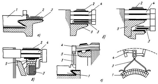 Рис. 4.27. Схема простой петлевой обмотки якоря, z= 14, К =42, иа = 3 Рис. 4.28. Примеры конструктивного выполнения уравнительных соединений первого рода: а — вилочные со стороны коллектора; б — вилочные со стороны, противоположной коллектору; в — кольцевые; г — эвольвентные; / — пластины коллектора; 2 — бандаж уравнительных соединений; 3 — уравнительные соединения; 4 — лобовые части обмотки якоря; 5 — обмоткодержатель