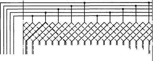 19\20\1 \2\3\q\S\6\7 \в\9\10\11\12\13\Щ15\16\17\16 Рис. 4.29. Схема двухходовой петлевой обмотки якоря при Kip, равном четному числу (к = 20, 2р = 4), с уравнительными соединениями В двухкратнозамкнутых двухходовых (т = 2) петлевых обмотках при К/р, равном четному числу, точки теоретически равного потенциала располагаются с разных сторон якоря. На упрощенной схеме такой обмотки (рис. 4.29) уравнительные соединения второго рода показаны слева от схемы. В таких машинах уравнительные соединения второго рода необходимо пропускать под магнито-провод якоря вдоль вала или через втулку (рис. 4.30). При К/р, равном нечетному числу, в двухходовых двукратнозамкнутых пет-