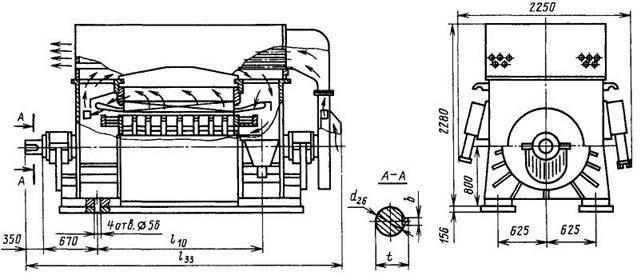 Изоляция обмотки статора — на термореактивных связующих. Обмотка ротора ко-роткозамкнутая, стержни обмотки ротора имеют профильное сечение, они впаиваются в медные короткозамкнутые кольца. Предусмотрен прямой пуск при напряжении сети не ниже 0,8 номинального. Допускаются два пуска подряд из холодного состояния или один пуск после продолжительной работы АД под нагрузкой. Последующие пуски допускаются через 3 ч. Двига- тели допускают пуск механизмов с моментом инерции до 7500 кг-м2. Основные размеры АД типа АДО приведены в табл. 9.80. Двигатели вертикального исполнения ВАКЗ предназначены для привода главных циркуляционных насосов АЭС. Для обеспече-