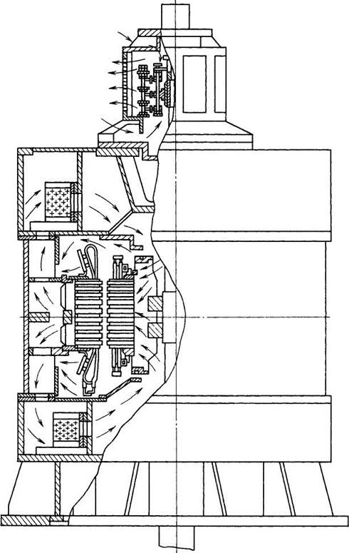 Рис. 9.17. Асинхронный вертикальный двигатель типа ВАКЗ ния эксплуатационных режимов электропривод с АД ВАКЗ выполнен с регулировкой частоты вращения 1:10. Технические данные двигателей ВАКЗ ВАКЗ 16-64-6 ВАКЗ 15-51-6 Мощность, кВт 3400 1600 Напряжение, кВ 6 6 Ток статора, А 374 185 Частота сети, Гц 50 50 Диапазон регулирования частоты вращения, об/мин.... 100-990 250-990 Напряжение на кольцах ротора, В...... 1630 780 Ток ротора, А 1280 1260 Соединение обмотки ротора... Д Д Момент инерции ротора с маховиком, кг-м2 1700 1400 КПД, %.... 95 94,8 Коэффициент мощности.... 0,915 0,88 Кратность максимального момента 2,6 2,4 Двигатели устанавливают в помещении с ограниченным доступом персонала. Двигатели типа ВАКЗ выполнены в подвесном исполнении с двумя направляющими подшипниками и подпятником с самовентиляцией по замкнутому циклу. Соединение валов АД типа ВАКЗ и насоса выполняется посредством эластичной муфты, не передающей осевую нагрузку от насоса к АД. Для обеспечения повышенного момента инерции в нижней части АД устанавливают маховики. Вентиляцию АД выполняют по замкнутому циклу с применением водяных трубчатых охладителей, встроенных в верхнюю и нижнюю крестовины (рис. 9.17). Система вентиляции радиальная, симметричная, с входом охлаждающего воздуха сверху и снизу АД. Циркуляция воздуха осуществляется за счет самовентилирующего действия ротора. Контактные кольца находятся вне замкнутого контура машины и охлаждаются окружающим воздухом. Подпятник и направляющие подшипники выполнены сегментными, самоустанавливающимися, с баббитовой поверхностью трения и размещены в масляных ваннах верхней грузонесущей и нижней опорной крестовин. Сегменты подпятника установлены на регулируемые по высоте винтовые опоры со сферической головкой. Смазка выполняется автономной, с постоянным объемом масла в масляных ваннах. Внутри масляных ванн циркуляция масла осуществляется за счет напорного действия радиальных отверстий во втулках подпятника и направляющего подшипника. Для охлаждения масла в ванны встроены маслоохладители из U-образных трубок, внутри которых циркулирует охлаждающая вода. Во избежание попадания масла на крышку насоса в нижней части крестовины АД предусмотрены дренажные камеры. Трехфазный токоподвод к обмотке ротора размещается в центральном отверстии вала. Каждая фаза обмотки ротора соединяется с токоподводом тремя изолированными шпильками через радиальные отверстия в валу, а с контактным кольцом — шиной через изолированные шпильки. Обмотка ротора АД типа ВАКЗ выполнена двухслойной волновой и уложена в полузакрытый паз. Лобовые части обмотки ротора бандажируют с помощью немагнитной стальной проволоки. Пуск АД осуществляется от системы асинхронно-вентильного каскада на минимальную частоту вращения при пониженном до 3 кВ напряжении на статоре. При частоте вращения 960 об/мин допускается работа АД с замкнутым накоротко ротором при максимальных моментах сопротивления насосов. Двигатели типа ВАКЗ допускают самозапуск агрегата после перерыва питания до 1,2 с при напряжении 0,6 —1,0[/ном.