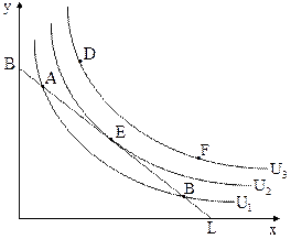 Что произойдет с BL, если Px увеличится? Сместится в положение BL1. Что произойдет с BL, если Py увеличится? Сместится в положение B1L. Наложим график бюджетной линии на карту безразличия. Какой товарный набор выберет потребитель? Из всех доступных для него наборов потребитель выберет тот, который принадлежит наиболее удаленной (высокой) от начала координат кривой безразличия. Скажем, т.т. A B > D F. Из всех точек, расположенных на BL или ниже ее, т.E является наиболее предпочтительной, т.к. все другие точки BL лежат на кривой безразличия, расположенной ниже. Каждая лучшая, чем E, точка, подобная F, лежит за пределами потребительских возможностей. Поскольку т.E дает наибольшее возможное удовлетворение потребителю, она и является точкой потребительского равновесия. В точке Е бюджетная линия является касательной к кривой безразличия.
