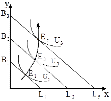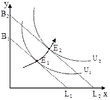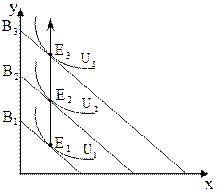 Рассмотрим изменение оптимума потребителя при изменении его доходов. Цены и предпочтения постоянны. Пусть доход потребителя увеличился. 1) Товары х, у – нормальные.