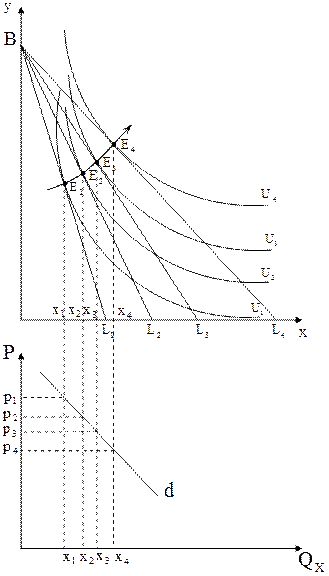 3.7. Реакция потребителей на изменение цены. Кривые «цена-потребление». Рассмотрим реакцию потребителя на изменение цены. Пусть цена товара х понижается. Каждое снижение цены на товар X поворачивает бюджетную линию против часовой стрелки до нового пересечения с осью X. При снижении цены товара х бюджетная линия BL1 последовательно занимает положение BL2, BL3, BL4. Равновесие потребителя смещается из точки Е1 в точку Е2, E3, E4 соответственно. Соединив эти точки, получаем кривую, называемую "цена-потребление". Кривая, связывающая все точки равновесия при изменении в ценах, есть кривая «цена-потребление». X1, X2, X3, X4 – количество товара X, которое потребитель мог бы купить, если бы он потратил весь доход. На основе кривой «цена-потребление» можно построить кривую индивидуального спроса. Для этого спроецируем точки равновесия на ось абсцисс и отметим цены товаров. Соединив точки пересечения, получим кривую индивидуального спроса D.