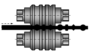 Периодические профили изготавливают всеми видами прокатки: продольной, поперечной и поперечно-винтовой. При продольной прокатке либо используют специально профилированные валки, либо насаживают на оси валков бандажи (рис. 4.20), профиль которых соответствует необходимой закономерности изменения прутка или полосы по длине. Кроме того, в процессе прокатки валки могут изменять своё межцентровое расстояние, т.е. раздвигаться и сдвигаться по определённой закономерности, придавая соответствующее изменение толщине заготовки вдоль её длины (рис. 4.21). Таким способом можно получать, в частности, клиновидные профили, в том числе, и периодические, например, для заготовок напильников.