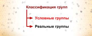 Среди отечественных классификаций групп можно выделить подход Г. М. Андреевой, представленный в учебнике по социальной психологии (Андреева, 1996). Здесь все группы подразделяются прежде всего на условные и реальные.
