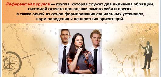 В 1942 г. американский социальный психолог Г. Хаймен ввел в научный оборот термин «референтная группа», применив его к такой группе, в соответствии с которой индивид оценивает свое собственное поведение или ситуацию, в которой находится. Хаймен проводил различие между группой членства, т. е. такой, к которой человек принадлежит в действительности, и группой референтной, которая используется как некоторая основа для сравнения.