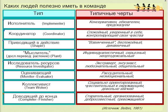 Каждая командная роль характеризуется определенными функциями в командной работе и требует соответствующих качеств от тех, кто выполняет эту роль. Обобщенно представленные командные роли и типичные их черты сведены в следующую таблицу: