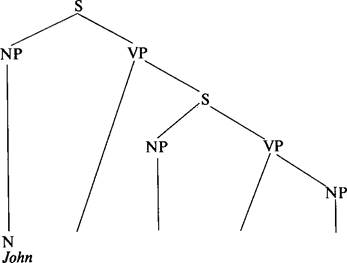 Другие рекурсивные фразовые категории могут допускать одноименную категорию не в виде непосредственной составляющей, а, например, на втором шаге развертывания: (15) a. [s John knew [s Einstein discovered relativity theory]] 'Джон знал, что Эйнштейн открыл теорию относительности'. (15) состоит из S, которое непосредственно включает NP John 'Джон' и VP knew Einstein discovered relativity theory 'знал, что Эйнштейн открыл теорию относительности'. Глагольная группа VP, в свою очередь, включает две непосредственные составляющие — V knew 'знал' и зависимую клаузу S Einstein discovered relativity theory '[что] Эйнштейн открыл теорию относительности'. Зависимая клауза делится на NP-подлежащее Einstein и VP discovered relativity theory 'открыл теорию относительности', которая дальше раскладывается на V discovered 'открыл' и NP relativity theory 'теорию относительности*. Для простоты приняв, что relativity theory — сложное существительное, изобразим этот анализ в виде следующего дерева составляющих [Freidin 1992: 11]: