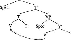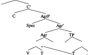 Полнознач. или вспом. глагол в инфинитиве Поэтому Поллок предложил не рассматривать I как нечто целое, а разделить ее на две вершины, соответствующие двум грамматическим признакам, — времени [±Tense] и согласовательным категориям числа и лица [±Agr], причем каждая из этих вершин возглавляет собственную максимальную проекцию. Передвижение глагола (V) может происходить путем адъюнкции к любой из этих вершин. Во французском языке полнозначный глагол в инфинитиве способен «добраться» только до нижнего из этих двух узлов, а глагол в финитной форме — до верхнего узла. В английском языке только вспомогательные глаголы могут пройти весь этот путь. Терминальная категория Agr представляет морфологические признаки глагольного согласования — лицо и число. Зги признаки по своей природе именные, но посредством согласования выражаются и в глаголе. Кроме того, они определяют форму им. п. ИГ-подлежащего, так как оно может быть в им. п., если глагол принимает положительное значение признаков финитности. ИГ-подлежащее порождается в SpecVP и передвигается в позицию спецификатора AgrP, чтобы вступить в отношение согласования с именными признаками вершины Agr (Spec-head agreement). Согласовательные признаки Agr получили в ПГ наименование (р-признаков (ф-features, phi-features). Глагол порождается как вершина VP. Во французском языке глагол передвигается в Agr через Т. При каждом передвижении происходит адъюнкция вершин, так что в Agr попадает уже сложная вершина, состоящая из [т V[T]]; в результате еще одной адъюнкции вершин («инкорпорации», как ее называют в ПГ) в узле Agr образуется комплекс (5) Адъюнкция глагола к вершине Т ТР