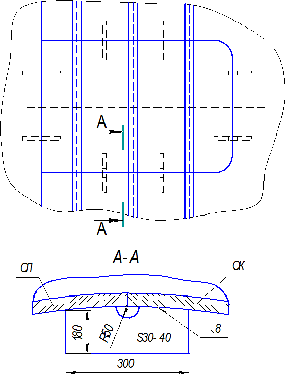 ДЕМОНТАЖ СЛ 3 ПОМЕЩЕНИЯ НА ПЛАВУ. 4.1.1 Работы по подготовке и вырезке СЛ 3 помещения выполнять согласно требований черт. 945-111-014, 945-111-007, 945-111-008, ОСТВ5.9610-83, ОСТВ5.9899-82 и 630.30-492-2006. 4.1.2 Зачистить сварные швы (если СЛ уже вскрывался) и основной металл ОК на ширину не менее 300 мм на каждую сторону от границ сварного шва или от линии реза СЛ. Выполнить очистку от спецпокрытия и загрязнений. 4.1.3 Проверить ОШЗ на отсутствие вмятин, трещин, царапин, не удаленных временных креплений, поверхностных окислений в соответствии с РДВ5.9559. 4.1.4 Выполнить осмотр сварных соединений обшивки и шпангоутов ОК на линии реза СЛ с применением лупы 4-х кратного увеличения. Выполнить люмконтроль сварного шва и ОШЗ СЛ шириной 20 мм на отсутствие трещин. Сдать ОКК. 4.1.5 Выполнить разметку контура СЛ согласно черт. 945-111-014, 945-111-007, 945-111-008 и в соответствии с требованиями РДВ5.9610 и РДВ5.95059. Выполнить измерения отклонений оси симметрии сварного шва (если СЛ уже вскрывался) от линии контура СЛ. На основании данных измерений комиссия принимает решение о разметке фактической линии реза с занесением в ЖОК. Сдать ОКК. 4.1.6 Наметить и нанести линию реза на внутреннюю и наружную поверхность обшивки ОК и шпангоутах с 2-х сторон. Линию реза закернить. 4.1.7 Наметить и нанести теоретическое положение шпангоутов на внутренней поверхности обшивки ОК и СЛ. Закернить. 4.1.8 Наметить и нанести линию ДП на корпусе и СЛ. Закернить. 4.1.9 Наметить и нанести контрольные линии на обшивке ОК с наружной и внутренней сторон, а также на шпангоутах с 2-х сторон на расстоянии 30 мм по обе стороны от линии реза. Закернить. 4.1.10 Наметить и нанести основные образующие на наружной и внутренней поверхностях обшивки в районе СЛ. Закернить. 4.1.11 Разметку СЛ под вскрытие следует выполнять при помощи паспортизированного инструмента (отвеса, рулетки, чертилки, кернера, молотка и др.). 4.1.12 Намеченные линии реза и контрольные на обшивке и шпангоутах ОК необходимо замаркировать в соответствии с ОСТВ5.9899. Сдать ОКК. 4.1.13 Кернение линии реза и контрольных линий выполнять с шагом: - на линии реза с шагом - 20 ÷ 40 мм; - на контрольных линиях пазов в каждой шпации (по 3-и керна в группе) с шагом - 10 мм; - на контрольных линиях стыков 500 ÷ 700 мм между группами (по 3-и керна в группе) с шагом - 10 мм; - на полках и стенках шпангоутов линия разметки чертилкой. Нанести контрольные линии на обшивке, стенках и полках ОК и СЛ на расстоянии 30 мм от размеченной линии реза. 4.1.14 Проверить наличие штатных обухов на СЛ установленных по черт. 945-111-016 (если СЛ вскрывался), проверить сварные швы приварки обухов визуальным контролем. При отсутствии обухов установить обуха по черт. 945-111-016. Сдать ОКК. 4.1.15 На внутреннюю поверхность ОК, после резки стыков и пазов СЛ (до разрезки шпангоутов и скруглений на обшивке), установить технологические планки и приварить к ОК катетом не более 8 мм с 2-х сторон. Прилегание планок к обшивке ОК должно быть не более 0,5 мм. Размер планок 180х300 мм, толщина 30 ÷ 40 мм, марка материала ПТ-3В, количество 8 штук смотри рисунок 1. Сдать ОКК.