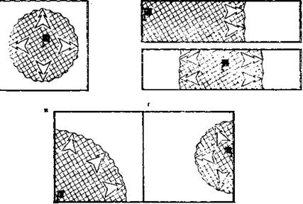 Формы площади пожараВ зависимости от места, возникновения горения, рода материалов, объемно-планировочных решений объекта, характеристики конструкций, метеорологических условий и других факторов площадь пожара имеет круговую, угловую и прямоугольную формы (рис.1.5). Такое деление является условным и применяется для упрощения расчетов при решении практических задач по пожаротушению.