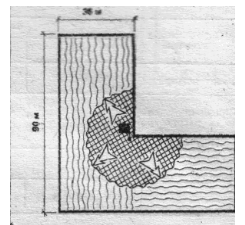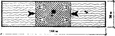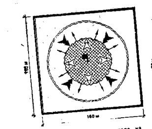 Примечания: 1. R и b - соответственно приведенные радиус и длина площади пожара; определяют измерением или по формулам: R = Uлt; b = Uлt. 2. Uл - линейная скорость распространения горения, м/мин (вычисляют по данным оценки обстановки пожара или принимают по справочным данным (см. разд.1.2). 3. t -время распространения горения до момента локализации пожара (см. уравнение п. 9.1 табл. 1.2). 4. a -угол, внутри которого происходит развитие пожара, рад. (1 рад» 57оС). 5. n - число направлений развития пожара в горизонтальной проекции. 6. m - коэффициент горючей загрузки или застройки, равный <1 (принимается по данным характеристики объекта). При разработке замысла на проведение пожарно-тактического учения или занятия с караулом пожарной части, составлений оперативных документов по пожаротушению и в других случаях задачи по определению основных параметров согласно табл. 1.14 решают в следующем порядке: вычерчивают план (схему) объекта в масштабе; находят возможную длину пути распространения горения R или b; полученный размер пути наносят в масштабе на план объекта и обозначают форму площади пожара; установленными условными знаками обозначают на плане возможную обстановку на пожаре по форме площади пожара устанавливают расчетную схему; определяют необходимые параметры пожара. Пример 1. Определить возможную обстановку на пожаре, а также параметры его развития, если горение возникнет в центре складской площадки тарной базы размером 160 ´ 160 м и будет распространяться в течение 30 мин со средней линейной скоростью 1,6 м/мин (рис. 1.7), горючая загрузка площадки составляет 70%.