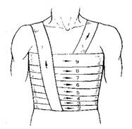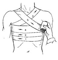 9. Окклюзионная повязка. Накладывается при пневмотораксе. Повязка выполняется следующим образом: а) рану закрывают стерильной салфеткой (лучше, если она смазана вазелином); б) поверх салфетки накладывают воздухонепроницаемый материал – оболочку от индивидуального перевязочного пакета, клеенку, полиэтилен, целлофан, а поверх него – толстый слой ваты; в) весь этот перевязочный материал закрепляется повязкой (спиральная с портупеей, крестообразная, др.)