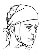 3. Пращевидная повязка. Накладывается на нос, губы, подбородок, лоб, затылок. Для этой повязки нужно взять отрезок бинта длиной 1 м. Бинт разрезают с обеих сторон на 40-45 см. Среднюю неразрезанную часть прикладывают к участку повреждения. Концы пращи перекрещивают (верхняя лента идет вниз, нижняя – вверх) и связывают сзади. Если пращевидная повязка применяется для иммобилизации перелома в области нижней челюсти, необходимо использовать двойной слой бинта, а между ними проложить слой ваты толщиной 2-3 см.