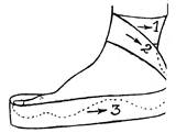 4. Возвращающаяся повязка. Накладывается на голову, кисть, стопу. Начинается с закрепляющих круговых туров, затем возвращающимися турами закрывают поврежденную поверхность. Закрепляют возвращающиеся туры спиральными ходами бинта. Повязка на кисть называется «варежка, а на стопу – «босоножка».