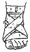 5. Крестообразная (восьмиобразная) повязка. Применяют для бинтования затылочной области, задней поверхности шеи, грудной клетки, лучезапястного и голеностопного суставов. Перекрест располагается над пораженной областью.