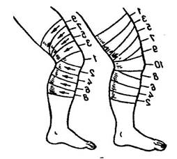 7. Черепашья повязка. Накладывается на область локтевого и коленного суставов. Существуют две разновидности этой повязки – сходящаяся и расходящаяся. Суставы должны находиться в согнутом состоянии.