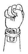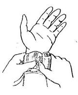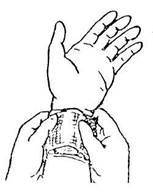 8. Давящая повязка. Применяется для остановки кровотечения из вен и мелких артериальных сосудов. При выполнении этой повязки на стерильную салфетку, закрывающую рану, кладут ватный, ватно-марлевый, марлевый тампон, скатанный бинт или чистый носовой платок и плотно прибинтовывают.